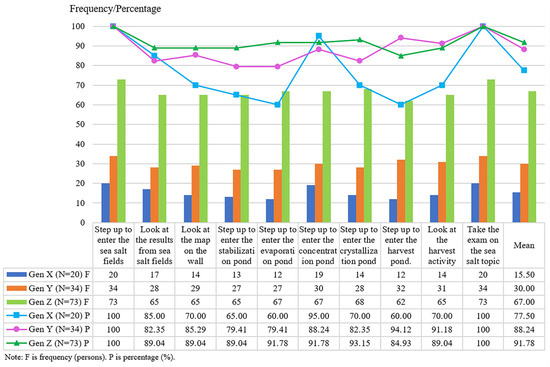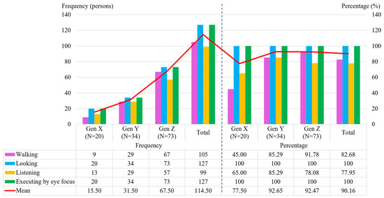 Results from studying the behavior of all participants found that approximately 105 out of 127 participants (82.68%) could independently participate in “Walking” activities on average, with Gen Z exhibiting the highest walking percentage (91.78%). All 127 participants (100%) displayed the capability to actively engage in “Looking” and “Executing by eye focus” activities autonomously. Additionally, 99 participants (77.95%) were proficient in participating in “Listening” activities without the need for staff assistance, with Gen Y showing a listening percentage (85.29%) greater than Gen Z and Gen Y. Moreover, when asked which activity within the virtual reality experience they enjoyed the most, the audience rated “Looking” and “Executing by eye focus” as the most enjoyable activity at a frequency of 127 (100%). The comparison result of the capability to actively engage is shown in Figure 8. In addition, the frequency and proportion of the sample’s capacity to engage autonomously in ten distinct AVL tasks are summarized in Figure 9. Considering each AVL task, it was found that the “Step up to enter the sea salt fields” and “Take the exam on the sea salt topic” tasks were the most engaging for all generations, accounting for 100%. The experiment results overall found that Gen Z most enjoyed the AVL tasks, with a mean value of 91.78%. Next were Gen Y and Gen X, with mean values of 88.24% and 77.50%, respectively.