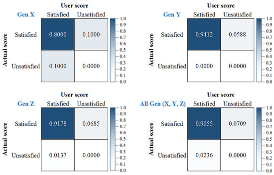This research applied the confusion matrix table to measure the accuracy of the developed AVL for sea salt production learning among user satisfaction levels that reflect the accuracy of AVL use through the user’s perspective. The satisfaction evaluation results of AVL users of all three generations (127 participants) in Table 5 were used to calculate the accuracy of the developed AVL in the normalized confusion matrix, as shown in Figure 10, where 1.0 is equivalent to 100% of all participants. The normalized confusion matrix shows that Gen Y users are satisfied, with the highest accuracy of 94.12%; meanwhile, Gen Z and Gen X users are satisfied, with an accuracy of 91.78% and 80.00%, respectively. Overall, the user was satisfied that the developed AVL had an accuracy of 90.55%. In comparison, the users were unsatisfied with a false negative of 7.09% and a false positive of 2.36%. These results show that the developed AVL is accurate and satisfies the users in this study.