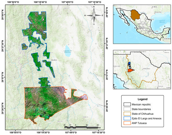 The study area is located in the western part of the state of Chihuahua, Mexico, and encompasses two zones: Ejido El Largo y Anexos, situated between 28°44′55″ N, 29°57′10″ N and 108°05′50″ W, 108°42′10″ W, and the natural protected area (NPA), Tutuaca, designated as a Flora and Fauna Protection Area (FFPA), located between 28°08′40″N, 28°44′50″ N and 107°29′40″ W, 108°42′05″ W (Figure 1). The area has a sub-humid temperate climate (C(w1)x’) with an average annual temperature between 12 °C and 18 °C, eutric cambisol soils, an average annual precipitation of 616.5 mm, and elevations ranging from 1093 to 2822 m [32]. The ANP Tutuaca exhibits four types of climates across its extension, predominantly a semi-warm sub-humid climate ((A)C(wo)), with an average annual temperature above 18 °C, haplic phaeozem soils, an average annual precipitation of 775.5 mm, and altitudes varying from 783 to 2764 m [32].
