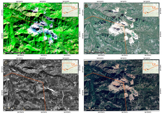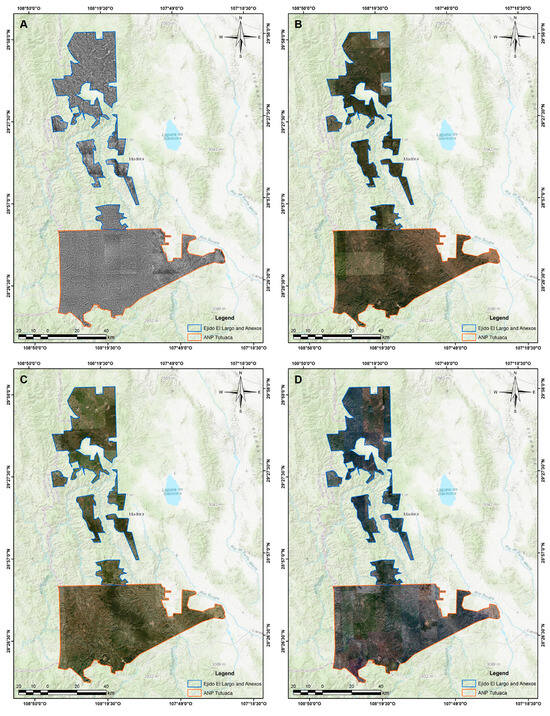 Orthomosaics of Ejido El Largo y Anexos and the Tutuaca Protected Natural Area, Chihuahua, for the years 1995 (A), 2008 (B), 2014 (C), and 2022 (D).