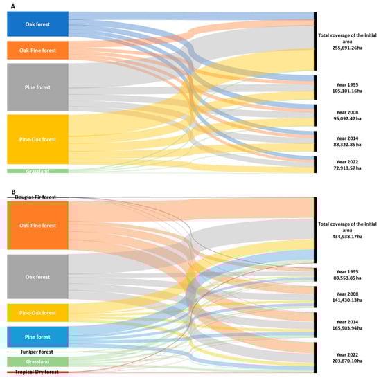 Figure 6 illustrates the evolution of vegetation cover in Ejido El Largo y Anexos and the Tutuaca Protected Natural Area (PNA) during the years 1995–2022. It shows a notable increase in grassland extent and a loss in oak forests and oak–pine mixed forests, especially in the Tutuaca ANP. In 1995, Ejido El Largo y Anexos was predominantly covered by pine and pine–oak forests, with a significant presence of temperate ecosystems. By 2008, oak and oak–pine forests had expanded their relative extent, reducing grasslands. This trend intensified by 2014, with a higher proportion of mixed forests and fewer grasslands. Finally, by 2022, there was a confirmed decrease in grassland areas and a clear predominance of pine and pine–oak forests. These changes reflect a significant transformation in land use and ecological dynamics in both regions. In this context, sustainable and adaptive forestry has proven to be an essential component in increasing tree cover in Ejido El Largo y Anexos. Additionally, restoration practices, including natural and assisted regeneration, promote the expansion of tree cover and the reduction of grasslands.
