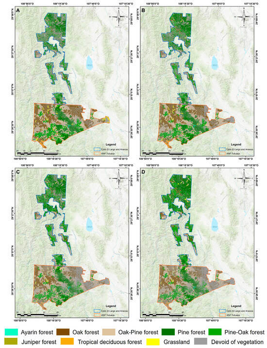 Evolution of vegetation cover in Ejido El Largo y Anexos and the Tutuaca Protected Natural Area for the years 1995 (A), 2008 (B), 2014 (C), and 2022 (D).