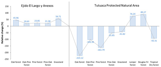 In contrast, the Tutuaca PNA experienced significant decreases in oak (−223.12%) and pine (−161.79%) forest areas, indicating possible changes in the management and conservation of these ecosystems, resulting in accelerated and sustained loss. On the other hand, Douglas Fir forests showed a significant reduction in coverage loss, with a relative change rate indicating an increase in forest cover within the PNA, as shown in Figure 7. These results underscore the importance of actively monitoring and managing forest resources to maintain biodiversity and ecosystem functionality in the face of environmental and anthropogenic pressures. Additionally, it highlights that sustainably managed and adaptively managed forests, as seen in Ejido El Largo y Anexos, tend to increase vegetation cover.