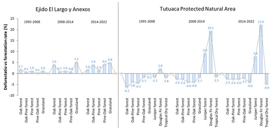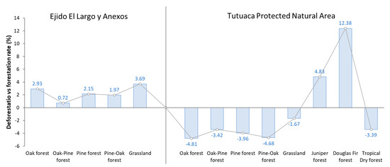 Figure 8 shows that in Ejido El Largo y Anexos, a decrease in deforestation is observed, primarily marked in oak and grassland ecosystems, with deforestation rates of 2.93% and 3.69%, respectively, followed by minor decreases in pine forests. In Tutuaca, significant forestation is highlighted in Douglas Fir forests (12.38%) and pine–oak forests (4.68%), while oak and pine forests showed significant loss of coverage, with deforestation rates of −4.81% and −3.96%, respectively.