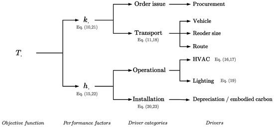The contribution of the presented drivers to each performance factor is summarized in Figure 1, where the categorization is valid for both economic and environmental perspectives. This hierarchy is also followed in Section 4.2 for the formulation of both cost and emission performance factors, which takes into considerations different components for each driver.