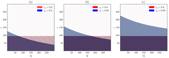 Decision space for varying values of input fill rate (blue), with ready rate (red) : (a) , (b) , and (c) .