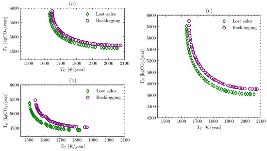 Pareto frontiers for lost sales and backlogging assumptions for (a) , (b) , and (c) .