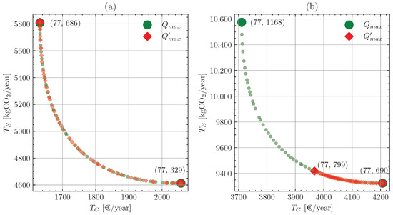 In order to highlight the importance of the transport component on inventory choices and performance, two scenarios are compared. Namely, the baseline vehicle capacity is compared with a reduction in of 50%. This is performed for both the studied warehouse locations. Figure 4 shows the resulting efficient solution in the objective space, where is the reduced shipment capacity. The difference in warehouse location plays a big role in the optimal choice of the reorder quantity for the economic anchor point, restricting the efficient solutions if transport capacity results are reduced. In particular, it can be observed how efficient solutions for a different warehouse location are determined by a different value of the reorder quantity. This aspect is shown from the anchor points of Figure 4b. Moreover, the objective space highlights the effect of this system characteristic on total costs and emissions. Similarly to Figure 3c, it can be observed that for the case study parameters the ready rate restricts the decision space by directly constraining the reorder level. These results confirm the need to consider sustainability perspectives as separate in order to address the issue of trade-offs between them. Additionally, considering the customer service level as another perspective via constraints allows for more comprehensive inventory decisions.