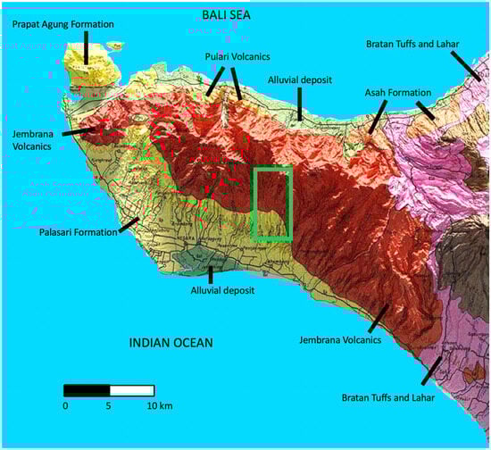 Geology and geography of westernmost Bali, Indonesia, showing the main geological formations; modified after [28]. The study area is indicated by the green box.