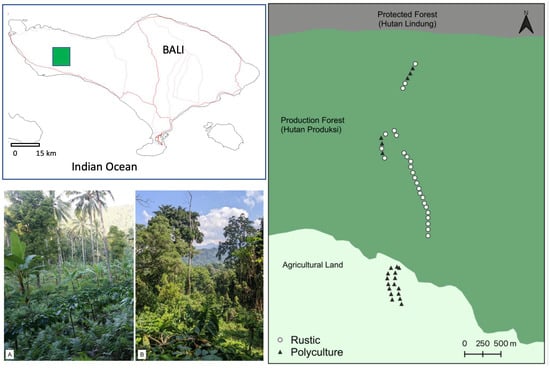 Study design in the western part of the island of Bali, Indonesia (top left), with rustic and polyculture plots in agricultural land and in production forests (right) and photographs of polyculture (A) and rustic (B) agroforestry systems. Note that five plots in the production forest area were classified as polyculture plots as they had no cover from forest tree species due to past forest clearance.