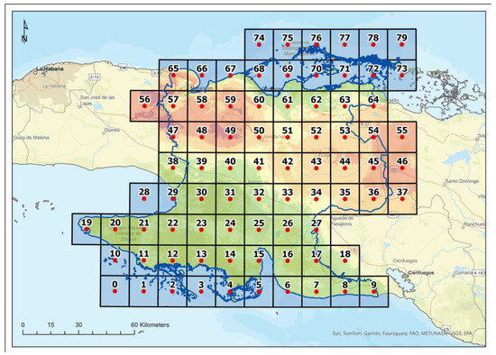 The site’s latitude is automatically set based on the geographical coordinates of the centroid of the DEM uploaded. This solar radiation tool was mainly designed for local scales, and if the study area is small, considering the same latitude for each cell is an acceptable approximation in the calculations of the solar position and declination. When large areas, such as regions, countries, or continents, are analyzed, the latitude can vary considerably between the different areas, affecting the results of the solar radiation. This tool does not allow us to set multiple values of the latitude; therefore, the large geographical areas have to be divided into smaller study areas with different latitudes (no greater than 1 decimal degree) [33]. The same consideration is valid for the clearness index and diffuse ratio, a single value per zone, so both parameters will be determined for each of the divisions. The province of Matanzas, which is a substantially larger area, was divided into smaller subareas for this purpose. The DEM presented in Figure 2 has been divided into 80 square rows with a size of 0.15 × 0.15 decimal degrees. Each block has been numbered proceeding from west to east and from south to north. This is one of the fundamental and most innovative aspects of the method proposed in this research.
