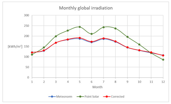 The trends of the monthly global horizontal irradiations calculated through Meteonorm (blue), point solar with original values of KT and KD (green), and point solar with corrected values of KT and KD (red).