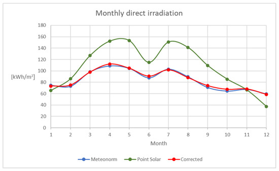 The trends of the monthly direct horizontal irradiations calculated through Meteonorm (blue), point solar with original values of KT and KD (green), and point solar with corrected values of KT and KD (red).