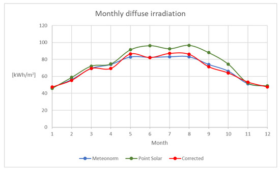 The trends of the monthly diffuse irradiations calculated through Meteonorm (blue), point solar with original values of KT and KD (green), and point solar with corrected values of KT and KD (red).