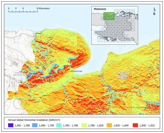 Finally, the resulting monthly solar maps of Matanzas are summed and merged. The map obtained (Figure 6) represents the annual global horizontal irradiation in Matanzas. The high resolution is hidden by the large scale of the area considered. A closer view would highlight the variation of the solar radiation pixel by pixel. In the northern part of the province, characterized by a mountainous landscape, a higher level of radiation is visible along the slopes. The relevance of this result is that any portion of this wide area can be extracted and used for eventual future studies.