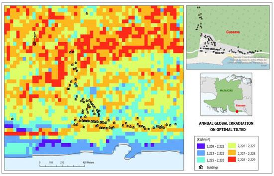 To conclude, from the solar radiation map of the province of Matanzas, we have to obtain the radiation values of the study area in the community of Guasasa (Figure 7). The calculated map of Matanzas refers to the global horizontal irradiation (GH), and it is necessary to determine the radiation available for a PV installation on the buildings distributed in the community. The assessment of the PV potential requires as input the solar radiation received by the solar panels’ surfaces, that is, by tilted surfaces. The surface angle considered is the optimal tilt angle (βopt). In order to calculate the global irradiation on the optimal tilted surface, a correction factor is needed.