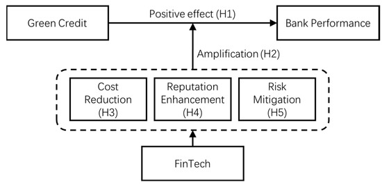 Drawing from the preceding analysis and hypotheses, we have constructed a mechanism design diagram that illustrates the relationships between green credit, FinTech, and bank performance, as shown in Figure 1, highlighting the significant interactions among these variables.