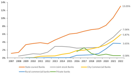 China’s green credit market, despite its relatively recent development, has rapidly developed and is now the largest in the world [3]. By the end of 2022, China’s green loans reached CNY 22.3 trillion (approximately USD 3.2 trillion), reflecting a 38.5% year-on-year increase from 2021. This growth outpaced total loan growth by 28.1 percentage points, with green credit accounting for 10.8% of the total loan balance, up 0.5 percentage points from 2021. The impact of green credit has been substantial, supporting the saving of over 600 million tons of coal and reducing more than 1 billion tons of CO2 emissions annually [4]. The Chinese banking sector has established a comprehensive green credit system and developed unique strategies to promote sustainable finance [5,6].