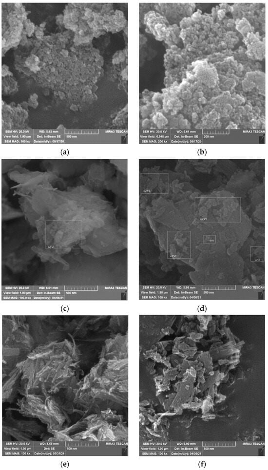 The FESEM micrographs of the nZVI and composites are given in Figure 1. FESEM micrographs of the nZVI sample (Figure 1a,b) show the agglomerates of very small particles, about 20 nm.