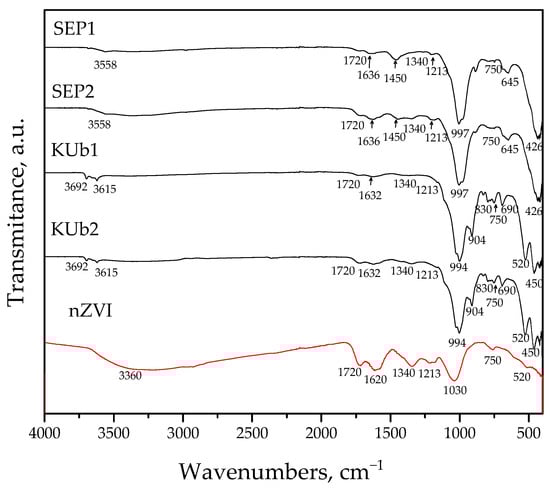 FTIR spectra of samples SEP1, SEP2, KUb1, KUb2 and nZVI.