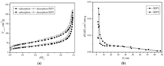 (a) N2 adsorption–desorption isotherms and (b) pore size distributions of SEP1 and SEP2.