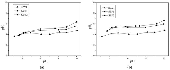 pHf vs. pHi during the equilibration of KUb1, KUb2 and nZVI (a), and SEP1, SEP2 and nZVI (b) with KNO3 solution concentration of 0.1 mol/dm3.