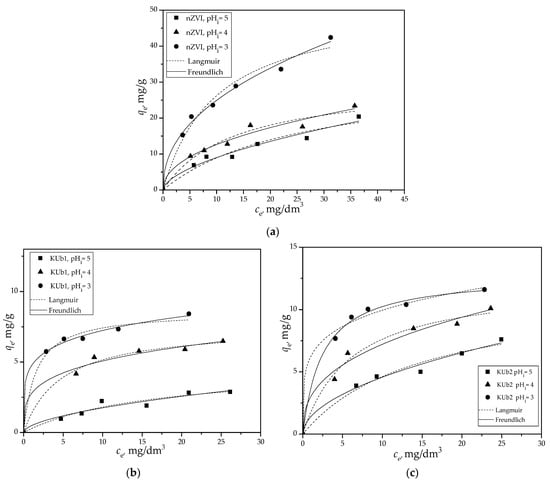 The removal of Cr(VI) using nZVI and composites KUb1, KUb2, SEP1 and SEP2 was investigated at pHi of 3 ± 0.1, 4 ± 0.1 and 5 ± 0.1, and the quantities of Cr(VI) removed are given in Figure 6. Table 3 summarizes the values of the Langmuir constants (qm (mg/g) represents the maximum adsorption capacity and KL (dm3/mg) is the Langmuir constant related to the energy of adsorption) and the Freundlich constant (Kf is the Freundlich constant related to the adsorption capacity (mg(1−1/n)·dm3/n/g) and n represents the dimensionless adsorption intensity parameter) [49,50] and R2, obtained by nonlinear fitting of the experimental data.