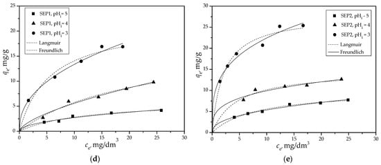 where ci is the initial concentration (mg/dm3), and ce represents the equilibrium concentration (mg/dm3). V (dm3) and m (g) are the volume of adsorbate solution and the mass of the adsorbent, respectively. The Langmuir [49] and Freundlich isotherm models [50] were used to fit the isotherm data.