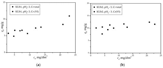 The dependences of the removal capacity of Cr(VI) and Cr total using KUb1 (a) and KUb2 (b) on the equilibrium concentration of Cr(VI) or Cr total in the solution at pHi = 3.0 ± 0.1.