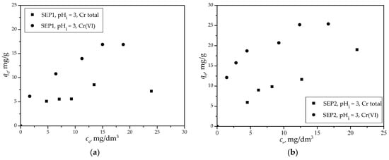 The dependences of the removal capacity of Cr(VI) and Cr total using SEP1 (a) and SEP2 (b) on the equilibrium concentration of Cr(VI) or Cr total in the solution at pHi = 3.0 ± 0.1.