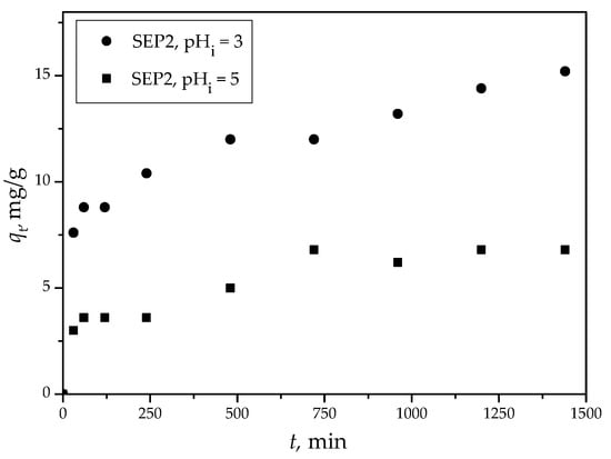 A higher Cr(VI) removal capacity of SEP was obtained at pHi = 3.0 ± 0.1 than at pHi = 5.0 ± 0.1 according to the kinetic studies. The dependences (qt (mg/g)—the removal capacity at time t vs. t (min)—time) are shown in Figure 9. This is in agreement with the previous results (Figure 6e and Table 4).