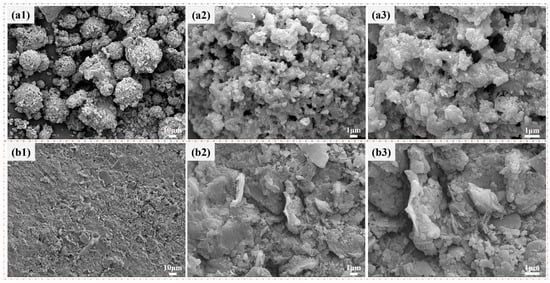 SEM images of raw materials: (a1–a3) MSWI-FA; (b1–b3) MS.