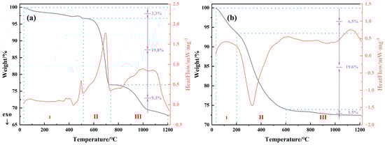 TG-DSC analyses of MSWI-FA and MS raw materials were conducted to study their thermal weight-loss processes, and the results are presented in Figure 3. Figure 3a shows the thermal weight-loss process of MSWI-FA in the presence of air, which could be categorized into three stages. The first stage, with 3.3% weight loss, occurred between 30 and 530 °C and involved the elimination of water (adsorbed water and crystalline water) and the decarboxylation of organic matter. The second stage occurred between 530–738 °C, showing a significant endothermic peak at 695 °C. It was attributed mainly to the decomposition of carbonate, resulting in a total weight loss of 19.8%. The third stage, with weight loss of 9.3%, occurred in the range of 738–1200 °C and was primarily characterized by the volatilization of metal chlorides with low boiling points. As seen in Figure 3b, the thermal weight loss of MS in the air atmosphere can also be divided into three stages. The first stage was characterized by an endothermic peak between 30 and 200 °C, mainly due to the removal of moisture from MS, resulting in a weight loss of 6.5%. The DSC curve showed an exothermic peak at 327 °C, corresponding to the second stage, which was primarily attributed to the combustion of the organic matter and fixed carbon in MS. The weight loss in this stage was 19.6%. The third stage occurred in the temperature range of 600–1200 °C. Only a small endothermic peak was observed at around 1150 °C in the DSC curve, possibly due to an endothermic reaction or the decomposition of different components in the MS. The weight loss in this stage was 1.5%, which was low. Overall, the weight loss of MSWI-FA during the thermal process in the temperature range of 30–1200 °C was slightly higher than that of MS.