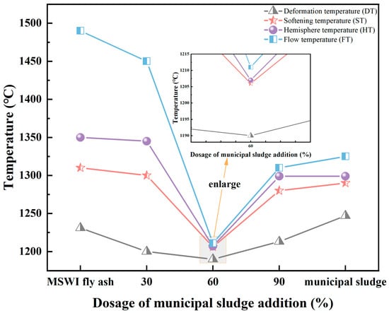According to the “Determination of fusibility of coal ash” (GB/T219-2008), the characteristic temperatures for MSWI-FA, MS, and their mixtures were assessed using the triangular cone test method. Figure 4 shows the flow temperature (FT) of MSWI-FA alone was remarkably high, reaching 1490 °C. Additionally, the FT of MS was slightly lower than that of MSWI-FA, but still reached 1325 °C. The addition of different amounts of MS showed a decreasing and then increasing trend in FT. Notably, for 60% of MS, the FT reached its lowest point at 1211 °C. Considering the melting characteristics of the mixture and to achieve energy conservation through temperature reduction, the temperature for the precursor preparation was set at 1200 °C.