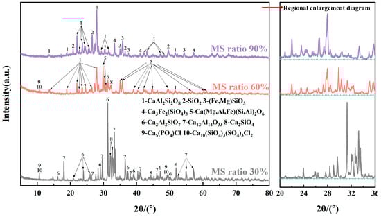 XRD patterns of mixtures with different ratios of MS after heat treatment.