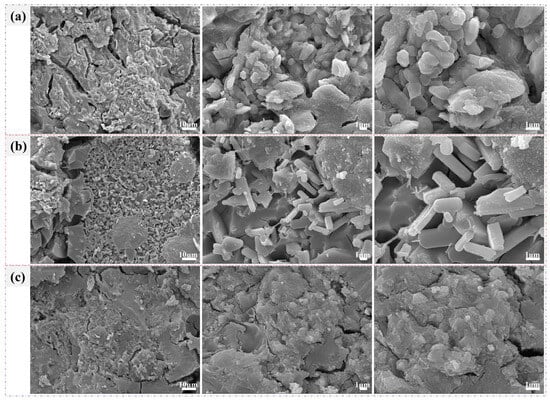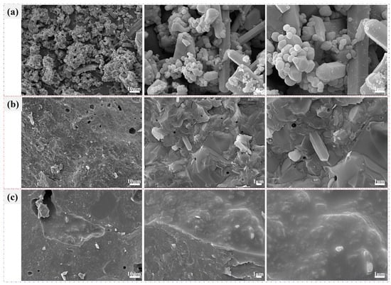 Figure 9 shows the microstructures of AAMs after 28 d of curing. In Figure 9a, the sample with 30% MS showed numerous cracks, with massive particles seen on magnification. These particles were interconnected by gel-like substances, resulting in their aggregation and stacking in large quantities. As depicted in Figure 9b, with the increase in MS content, the cracks in the sample decreased. Magnification showed a significant number of rod-like crystals and some gel materials. Furthermore, in Figure 9c, when the MS content was further increased to 90%, the surface cracks of the sample decreased further. The magnified image showed a substantial amount of gel. Additionally, short columnar crystals were enveloped by the gel, resulting in an overall highly dense material structure.