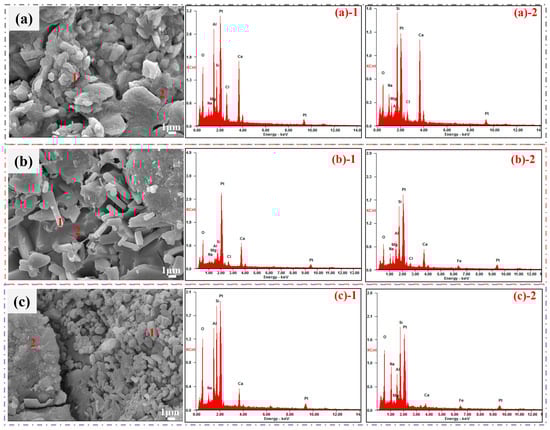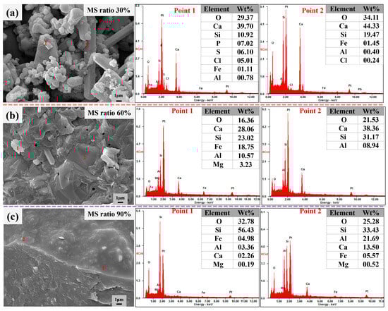 When the MS content increased to 90% (Figure 7c), a melting zone could be observed in the microstructure. The main elements at Point 1 were O (32.78%) and Si (56.43%), accounting for more than 89% of the composition, suggesting that the main phase was SiO2. At Point 2, the main elements detected were O, Si, Al, and Ca, with small amounts of Fe and Mg. The analysis of Figure 5 indicated that the main phases at this time were CaAl2Si2O8 and a small amount of (Fe, Mg) SiO3. These findings were consistent with the results from Figure 7b.