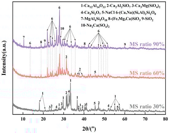 Figure 5 presents the XRD patterns of MSWI-FA and MS mixtures in different proportions, after subjecting them to heat treatment at 1200 °C with a 30-min heat retention period. When the MS doping amount was small (30%), the mixture had a higher Ca content. The predominant crystalline phase observed after heat treatment was Ca2Al2SiO7, along with certain amounts of Ca12Al14O33 and Ca2SiO4. Combining Figure 1 and Figure 3, it can be seen that before 800 °C (the second stage in Figure 3a), CaCO3 in MSWI-FA decomposes, providing CaO that reacts with MS. The reactions that occur are as follows: