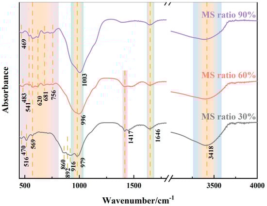 Figure 11 shows the FTIR spectra of AAMs prepared using different precursor systems to investigate changes in their molecular structures and chemical bonds. The spectral peaks in the range of 460–760 cm−1 in all alkali-activated samples were attributed to the in-plane bending vibrations of the Si-O and Al-O bonds, as well as the bending vibrations of the Si-O-Si and O-Al-O bonds [55]. It was observed that the center of the peak between 979 cm−1 and 1003 cm−1 was shifted towards a higher wavenumber, with an increase in the amount of MS proportion. The peak seen initially at 979 cm−1 shifted to 996 cm−1 and finally reached 1003 cm−1. These peaks were attributed to the vibrational stretching modes of asymmetric silicates (Si-O-Al) and silicon–oxygen bonds (Si-O-Si) [56]. As compared to AAM-30%MS and AAM-60%MS, AAM-90%MS had broad spectral peaks, which indicated an increase in amorphous features [57,58]. This result was consistent with the results in Figure 5.