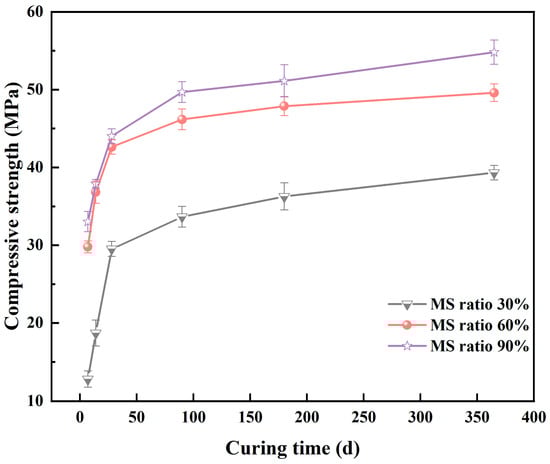 (2) The strength-activity indexes of the precursor prepared in this work indicated that as the proportion of MS increased, the reaction activity index significantly increased. High reactivity contributed to enhancing the strength of the synthetic AAM mortar. After 28 days, AAMs with the addition of 90% MS exhibited the highest compressive strength of 44.1 MPa, which further increased to 54.8 MPa after 365 days.