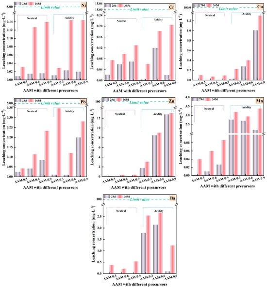 It could be inferred from Figure 13 that higher amounts of heavy metals were detected when acetic acid was applied. In literature [66], the influence of leachate pH on the leaching characteristics of heavy metals from geopolymers was investigated. For most of the heavy metal elements, the leached amounts were maximum in an extremely acidic pH, particularly pH <2. Zn, Pb, Mn, and Ba were leached as cations in high concentrations under extremely acidic conditions, and their concentrations progressively decreased as the pH increased. The primary controlling factor was the low solubility of components containing these elements in alkaline conditions [67]. Typically, these elements were effectively immobilized within AAM [68,69]. Research [66] showed that Cu and Ni exhibited amphoteric leaching behavior, whereas Cr was released as anions. In the former case, the concentration increased in both acidic and alkaline conditions. Engelman et al. [70] stated that hydrous ferric oxide (HFO) and dissolved organic carbon (DOC) had significant influence on the leaching of Cu and Ni from cementitious materials. For elements that leached in their oxyanionic forms, the maximum leaching concentration was observed under the most acidic conditions, as well as the natural pH of the material. Natural pH refers to the pH value of the mixture containing only AAM grains and deionized water, without the addition of acidic or alkaline chemicals. This refers to Cr, which has the tendency to form oxyanions. The concentrations of Cr in acetic acid solution and deionized water, shown in Figure 13, were comparable, and they could be roughly considered to be the maximum releases from synthesized AAMs. All these demonstrated the environmental compatibility of the AAMs produced from MSWI-FA and MS in this work.