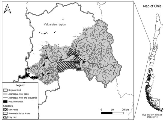Figure 1. Study area 1: Aconcagua Valley. Source: Map based on geographical information from DGA, INE, and BCN [57,58,59].