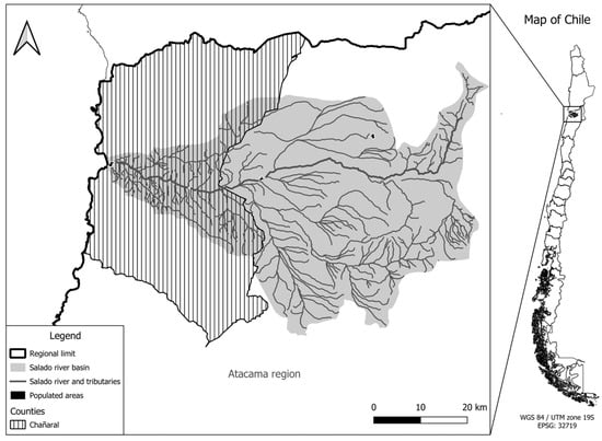 Figure 2. Study area 2: Chañaral. Source: Map based on geographical information from DGA, INE, and BCN [57,58,59].