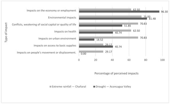 Figure 3. Percentage of mentions of perceived impacts of drought and extreme rainfall 1. 1 Based on the total of interviewees: N = 24 for Chañaral, and N = 27 for Aconcagua.