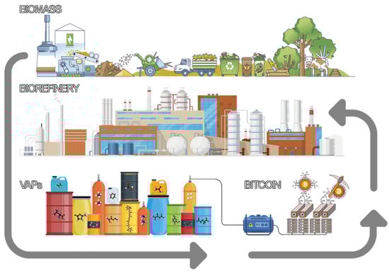 Contrary to current public opinion, Bitcoin has the potential to positively contribute and even accelerate the United Nations Sustainable Development Goals [1,6,7,8]. This perspective article explores the intersection between biomass, biofuels, and biorefineries and how their potential relationship, specifically the integration of Bitcoin and other Bitcoin-related activities, could aid IBs. Bitcoin holds a role in financial portfolio diversification [9]; however, whether asset diversification also pertains to biorefineries producing real-world resources has yet to be studied. The proposed hypothesis is simple. Biorefineries generate biofuels either by utilizing waste by-products from post-processing or by directly converting biomass into biofuel and other value-added products (VAPs). Cheap or excess bioenergy can be used in Bitcoin mining, increasing revenues, and improving the biorefinery capital structure. This, in turn, could positively influence the financial aspect of biorefineries, enabling them to continue financing their operations. The proposed approach is shown in Figure 1. This symbiotic relationship not only optimizes energy use but also generates additional revenue streams, enhancing the economic viability of biorefineries. Access to reliable cheap energy, either purchased or produced onsite from biofuels, could make Bitcoin mining a highly profitable endeavor that aids in offsetting costs. Bitcoin offers a unique approach at driving much needed innovation, profitability, and sustainability in this sector by making biorefinery more profitable and thereby cheaper to operate. However, it easier said than done and requires detailed modeling and analysis of their co-integration. As Bitcoin technology continues to evolve with advancements in scalability and interoperability, more businesses will start to integrate and adopt Bitcoin as a monetary means, thereby fostering greater efficiency. Process designers and financial analysts must, on a case-by-case basis, determine whether a buy vs. make analysis of BTC is warranted or if BTC as an element of an IB balance sheet is warranted in the first place, though it has been demonstrated to be a profitable strategy to incorporate Bitcoin into an organization’s long-term vision [10,11].