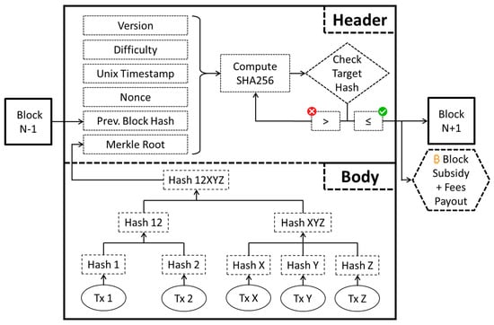 Bitcoin is the first application of blockchain. Blockchain is the underlying technology which facilitates Bitcoin, ensuring its decentralized, secure, immutable, and transparent nature. Essentially, a blockchain is a distributed ledger that keeps track of transactions across numerous nodes. Each block can be divided into a block header and block body, as shown in Figure 2. The block body contains information about the transactions. These transaction data are stored in a Merkle tree structure [52]. The Merkle root is the hash of all the hashes of all transactions inside a block. A hash is a fixed-length alphanumeric string generated by the Secure Hash Algorithm 256 (SHA-256) cryptographic algorithm. It uniquely represents the input data, and miners solve for a hash that meets specific criteria to validate transactions and create new blocks in the blockchain. The SHA-256 algorithm is a one-way function. Any length input will yield a fixed length output; however, one cannot compute the input from the output. Moreover, changing the input ever so slightly will change the output drastically, in a non-reversible and non-deterministic manner. Therefore, all transactions are backed up to the first block are recorded and stored in blocks [53,54]. The block header includes information about the timestamp, difficulty, nonce, Merkle root, and the previous block’s hash. Thus, all blocks are linked in chronological order using cryptography and form an immutable chain.
