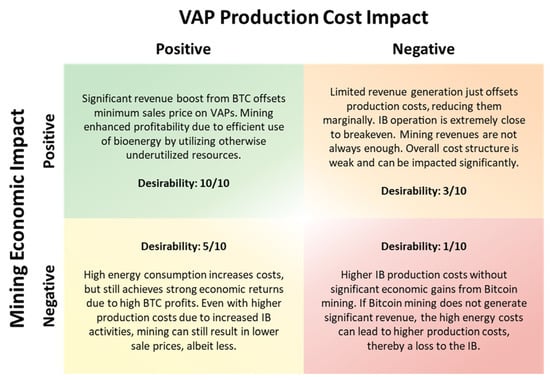 A 2 × 2 matrix evaluating the impacts of integrating Bitcoin mining into biorefineries. High desirability/best case scenario (green); low desirability/worst case scenario (red). The central white area signifies a passive “do nothing, gain nothing” approach.