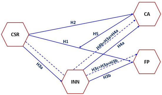 The theoretical model of this study explains the mediating role of innovation (INN) in the association between CSR and FP, as well as between CSR and CA. Additionally, the model proposes that CA moderates the association between CSR and FP. The hypotheses presented within this study’s framework are depicted in Figure 1.