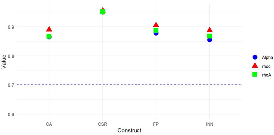 Due to the high correlation among the indicators constituting each construct or latent variable, the model consists of four composite reflective constructs, including CSR, INN, FP, and CA, which are estimated in mode A [67,68].