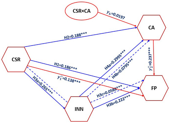 The coefficients , denote the effects of the independent variables on the dependent variables. The coefficients represent the mediated effects of CSR on FP through INN and the mediated effects of CSR on CA through INN, respectively. The coefficient represents the simple effect of CSR on FP that is moderated by CA, while represents the direct effect of CA on FP, accounting for the interaction with CSR. The error terms are denoted by .